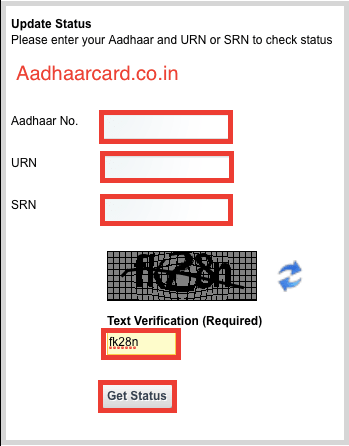 3. Enter your Aadhar Number, Your Update Request Number (URN) and Captcha in their Fields.