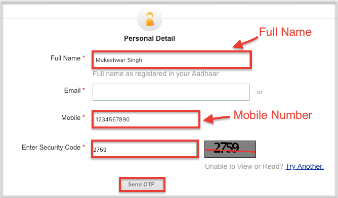 4. Enter your Full Name, Mobile Number and Security Code in their fields and Click Send OTP. An OTP Will be sent to your Registered Mobile Number