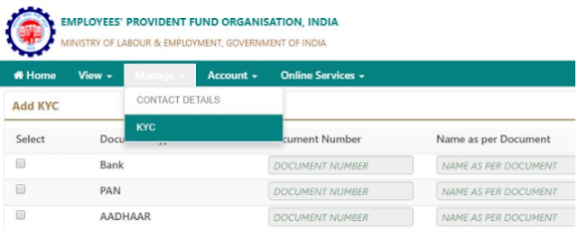 ❷ Make yourself logged in by using your UAN credentials. When you’re on the main page of the UAN portal, Go to the main menu and click on the “MANAGE”, a drop-down menu will now appear, now select “KYC”.