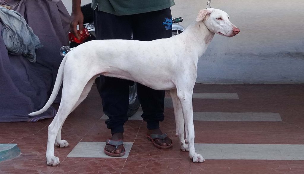 Rajapalayam is a large-sized sight-hound dog, generally between 65–75 cm (20-30 inches) and weighs around 32-42 kgs. Rajapalyam dogs are only available in white and with an extremely pinkish nose. They live up to 10- 12 years. These dogs don’t do well with strangers but are very loyal and loving to their owners.