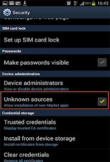 • Scroll down till you see the optionย Unknown Sources, tap that and enable it.
