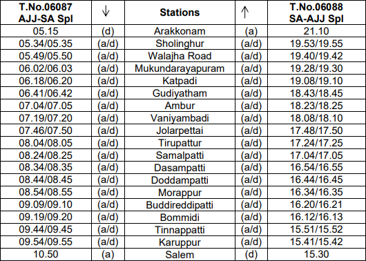 In Return direction Train No. 06088 Salem – Arakkonam Memu Express Special Train on Mondays, Tuesdays, Wednesdays, Thursdays, Fridays (5 Days a Week) will leave Salem at 15.30 hrs on and from 06th January, 2021 and reach Arakkonam at 21.10 hrs, the same day until further advice