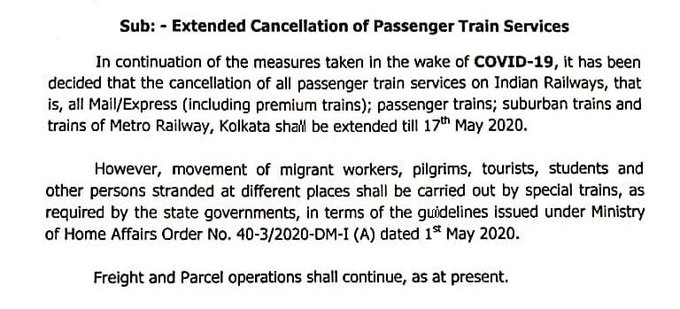 In continuation of the measures taken in the wake of COVID-19, it has been decided that the cancellation of all passenger train services on Indian Railways, that is, all Mail/Express (including premium trains); passenger trains; suburban trains and trains of Metro Railway, Kolkata shall be extended till 17th May 2020.