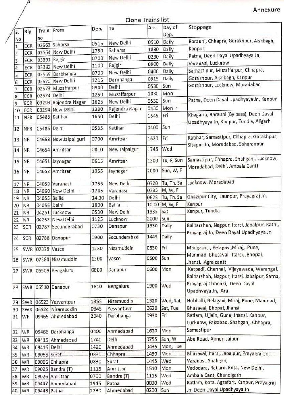 Considering the huge demand for travel on specific routes, Ministry of Railways has decided to run 20 pairs of Clone Special trains (list annexed in the link below) from 21.09.2020. These Clone trains will run on notified timings and will be fully reserved trains. The stoppages shall be limited to operational halts.