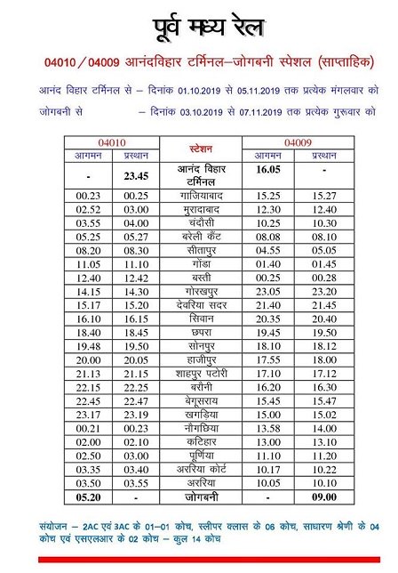 Train No. 04010 Anand Vihar Terminal-Jogbani 01.10.2019 to 5.11.2019 weekly special train