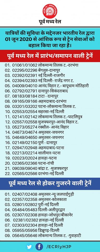 Due to the facility of passengers, the train services are being restored by the Indian Railways on 01 June 2020 These trains are as follows in the east central rail and the trains passing through the east central rail area are as follows