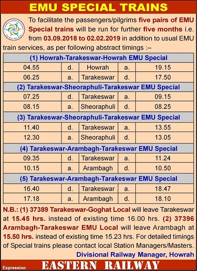 EMU Special Train Howrah-Tarakeswar, Tarakeswar-Sheoraphuli and Tarakeswar-Arambagh Howrah-Tarakeswar, Tarakeswar-Sheoraphuli, Tarakeswar-Arambagh EMU Special Train from 03-09-2018 to 02-02-2019 EMU Special Train Howrah-Tarakeswar, Tarakeswar-Sheoraphuli and Tarakeswar-Arambagh By irctcportalPosted on September 3, 2018Posted in Special TrainsTagged SPECIAL TRAINS Post navigation IRCTC Tour Package from secunderabad to tirupatiChennai to Sabarimala Train Package