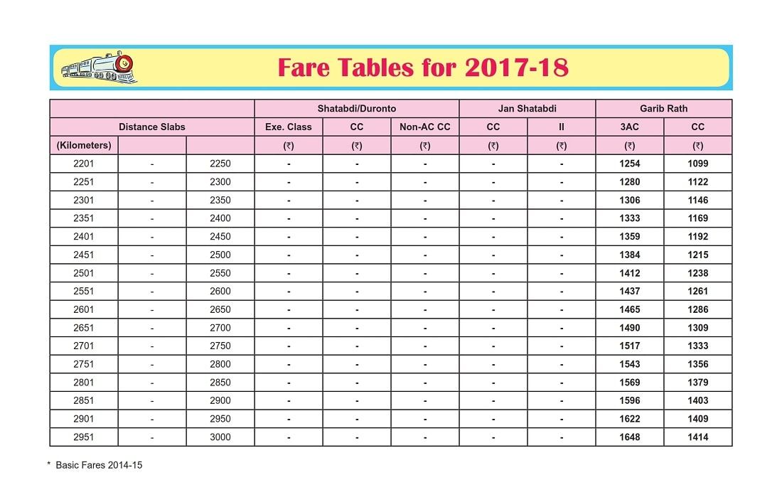 Garib Rath / Jan Shatabdi Fare Chart 2017-18 Railway Fare Chart 2017-18 Mail / Express Fare Chart 2017-18 Rajdhani / Duronto Fare Chart Shatabdi / Duronto Fare Chart Garib Rath / Jan Shatabdi Fare Chart Mahamana Express Fare Chart Tejas Express Fare Chart Antyodaya Express Fare Detail Humsafar Express Fare Detail Source: indianrailways.gov.in Garib Rath / Jan Shatabdi Fare Chart 2022-23 By irctcportalPosted on January 8, 2018Posted in Railway Fare ChartTagged Railway Fare Chart, Railway Fare Chart 2017-18, railway fare chart kilometer wise 2017-18, railway fare table 2017-18, train fare chart kilometer wise 2017-18, train fare table 2017-18 Post navigation Antyodaya Express Fare Detail 2022-23Tejas Express Fare Chart 2022-23