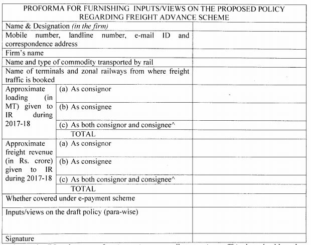 Rail freight customers are requested to offer their inputs/views on the proposed draft policy regarding Freight Advance Scheme (given in ANNEXURE) as per the proforma at the following address, within 30 days.