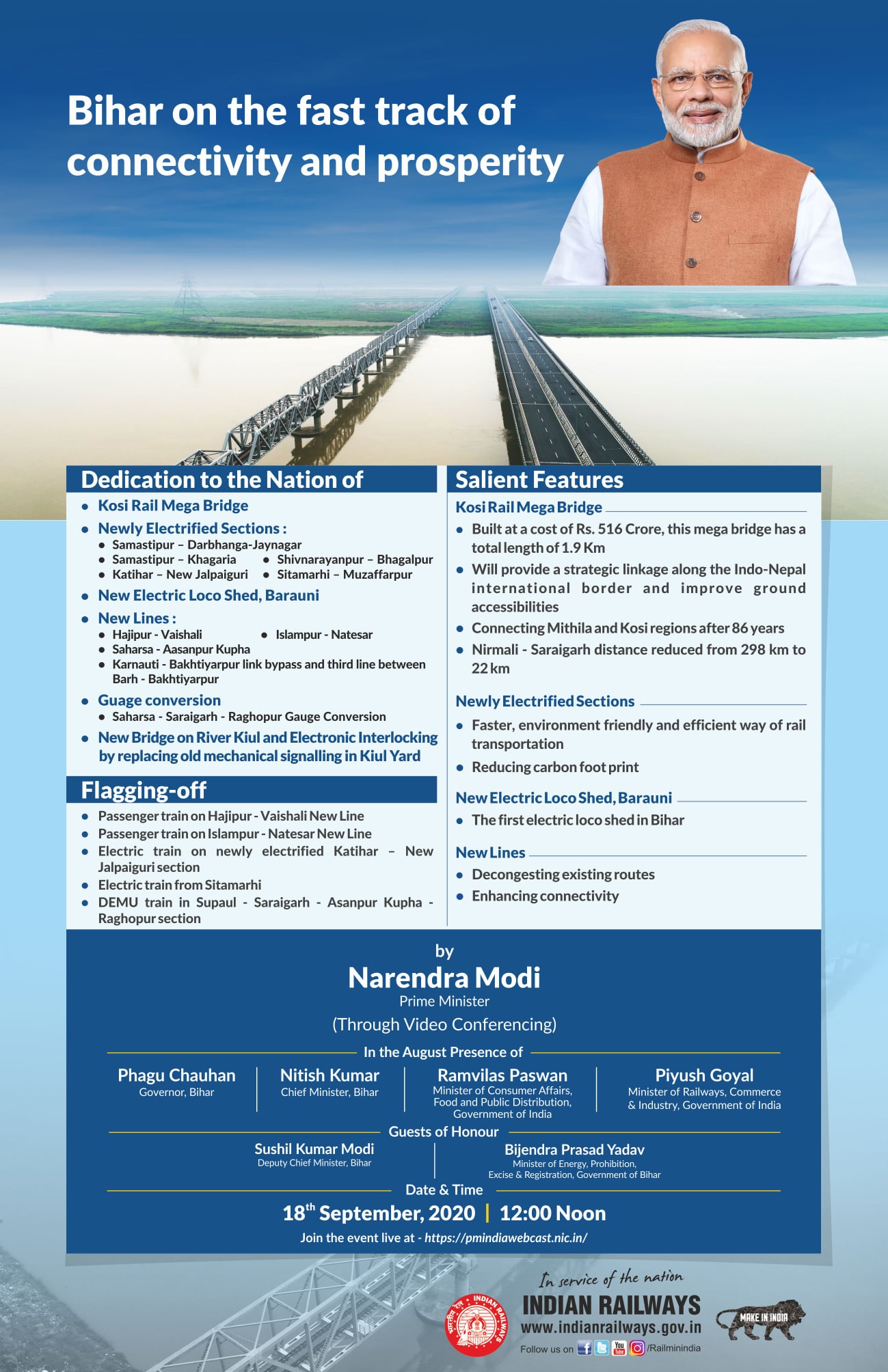 Prime Minister Narendra Modi will dedicate the historic Kosi Rail Mahasetu (mega bridge) to the nation through video-conference tomorrow. Apart from this, the Prime Minister will also inaugurate 12 rail projects related to passenger facilities for the benefit of the Bihar. Chief Minister Nitish Kumar will also be present on this occasion.