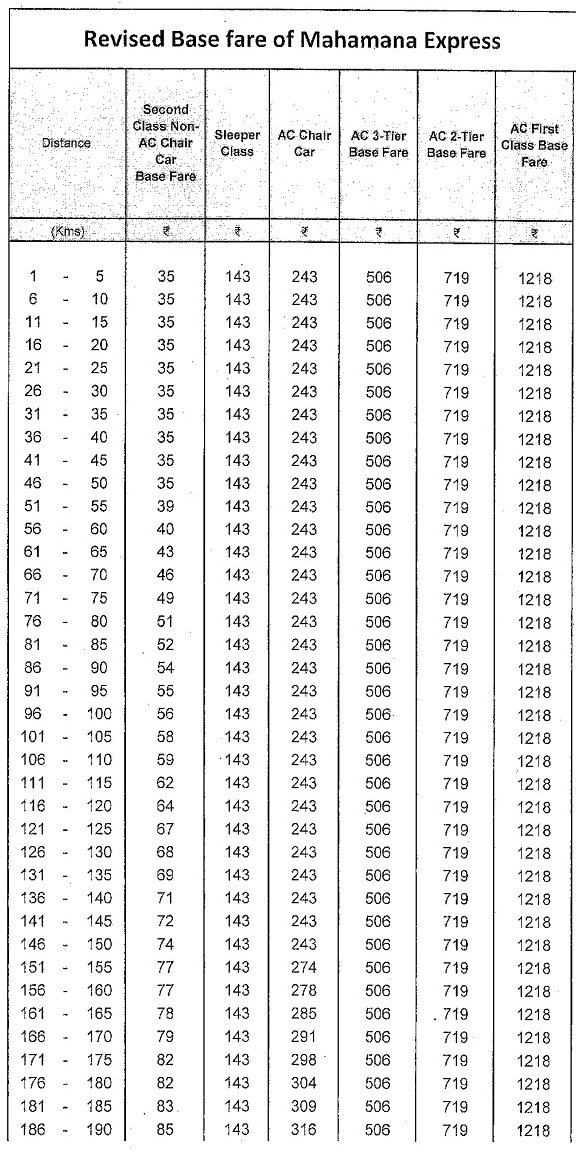 Mahamana Express Train Fare Table 2020-2021 (Distance Slabs: 1-190)