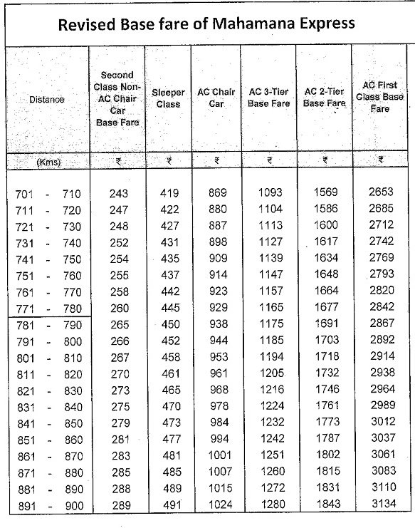 Mahamana Express Train Fare Table 2020-2021 (Distance Slabs: 391- 700)