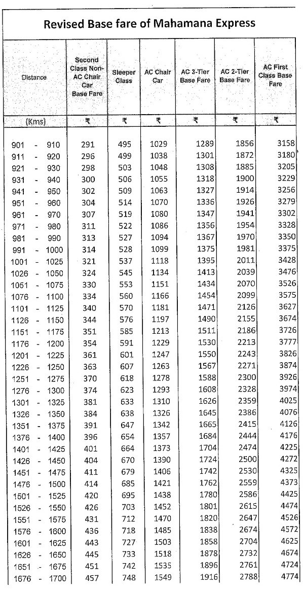 Mahamana Express Train Fare Table 2020- 2021 (Distance Slabs: 4001- 5000)
