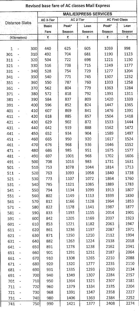 Indian Railways ticket fares are separate for the peak and lean seasons.