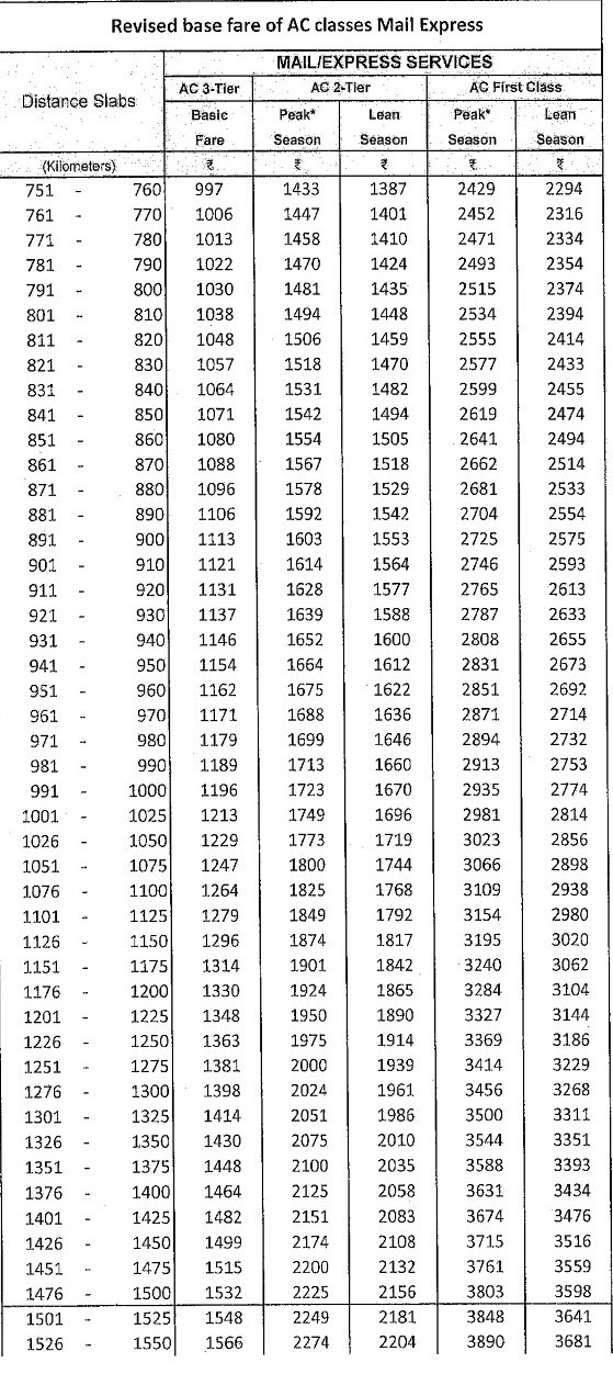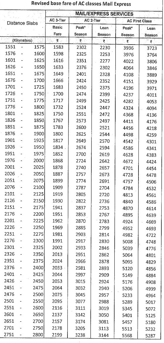 Mail and Express AC 3 Tier, AC 2 Tier and AC First Class Fare Table 2023-2024