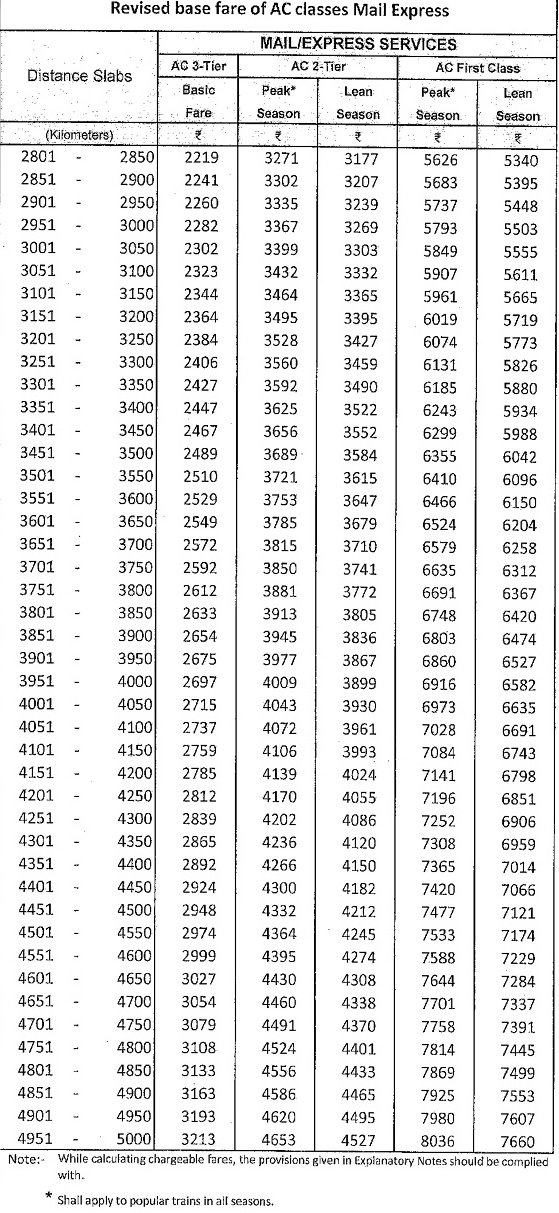 AC Class Mail Express Fare Table 2020-2021 (Distance Slabs: 2801- 5000)
