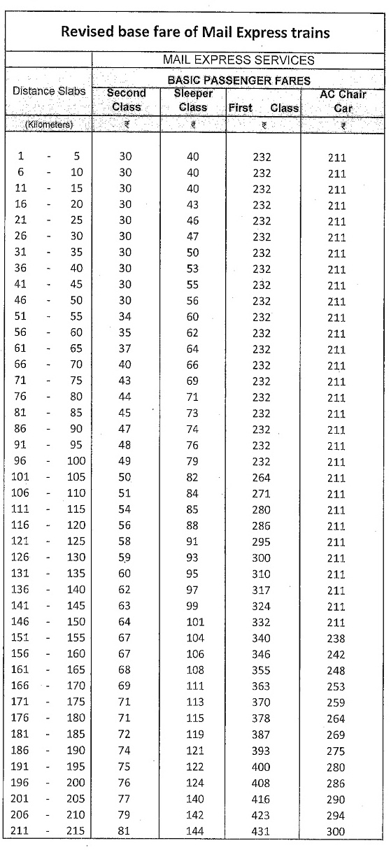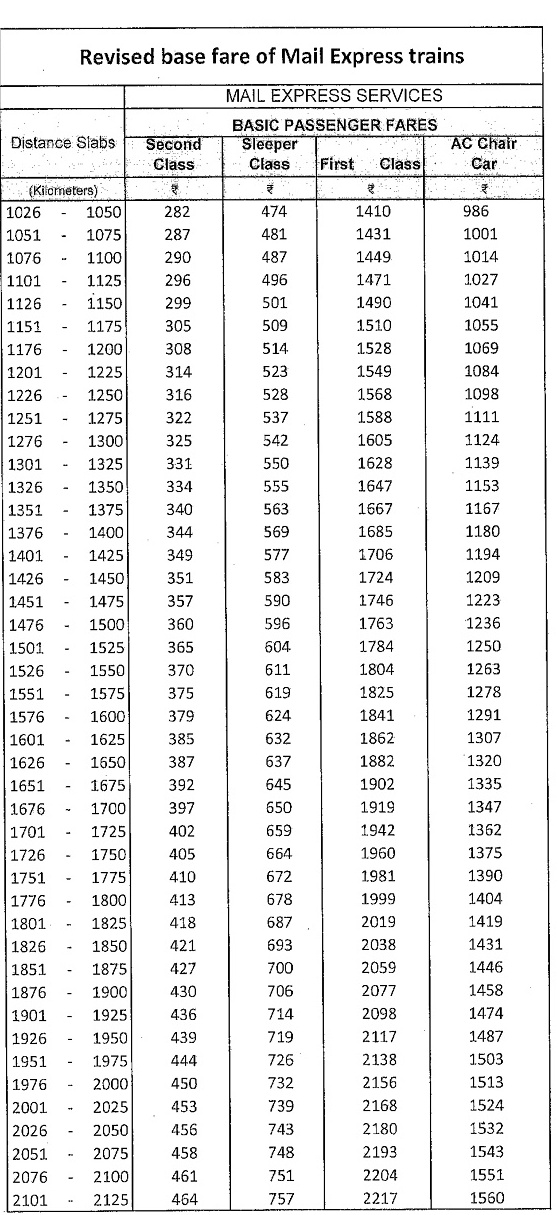Mail Express Basic Passenger Fare for Second Class, Sleeper Class, First Class and AC Chair Car Fare Table and Chart