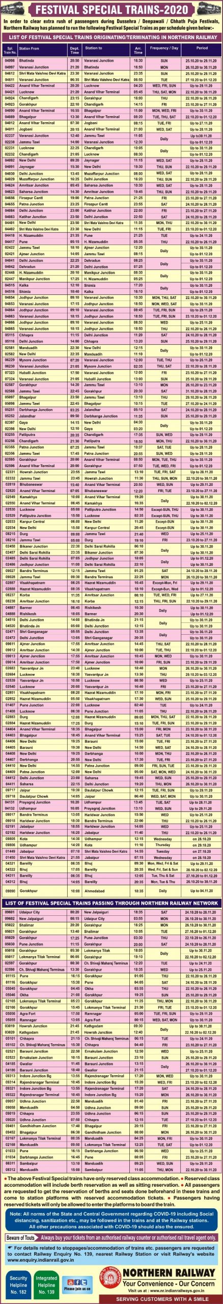 Click Here To Download: Northern Railway Chhath Puja Special Train and Diwali Special Train