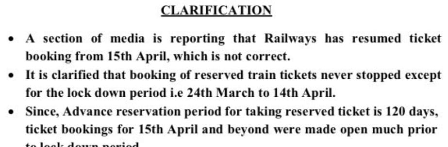 In view of certain media reports that Railways has started reservation for post lock down period, It is clarified that reservation for journeys post 14th April was never stopped and is not related to any new announcement.