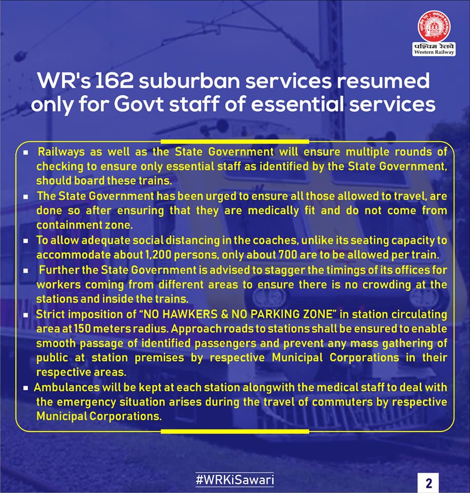 WR has resumed 162 suburban services with defined protocol & SOP, only for movement of essential Govt staff as identified by the State Government. Only essential services workers with proper ID Cards will be allowed to travel in these trains