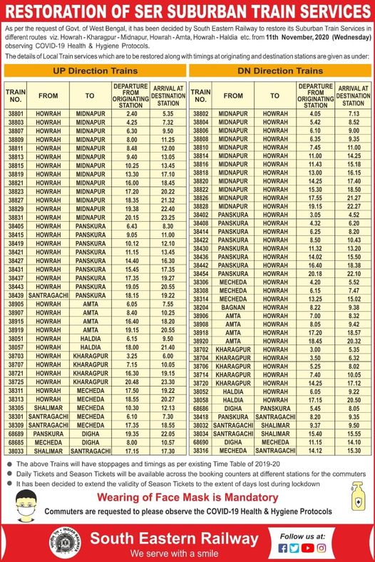 As per the request of Govt. of West Bengal, it has been bedded by South Eastern Railway to restore its Suburban Train Services in different routes viz., Howrah-Kharagpur-Midnapur, Howrah-Amta. Howrah-Haldia etc. from 11th November 2020 (Wednesday) observing COVID-19 Health & Hygiene Protocols.