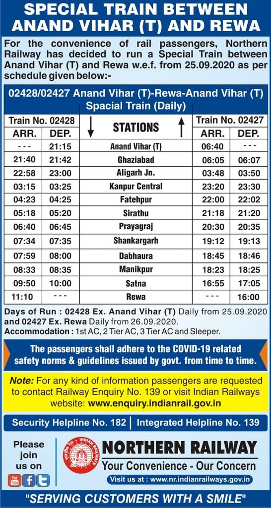 Special train will leave Train No. 02428 Anand Vihar Terminal at 21.15 hrs and arrive Rewa at 11.10 hrs and train running time between the station 13h and 55 minutes.