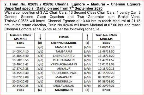 Train No. 02635 / 02636 Chennai Egmore – Madurai – Chennai Egmore Superfast special (Daily) on and from 7th September 2020