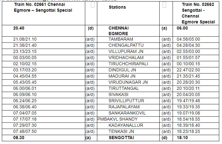 - Special train between Pothigai Express Chennai Egmore-Sengottai (Train No 02661/ 02662)