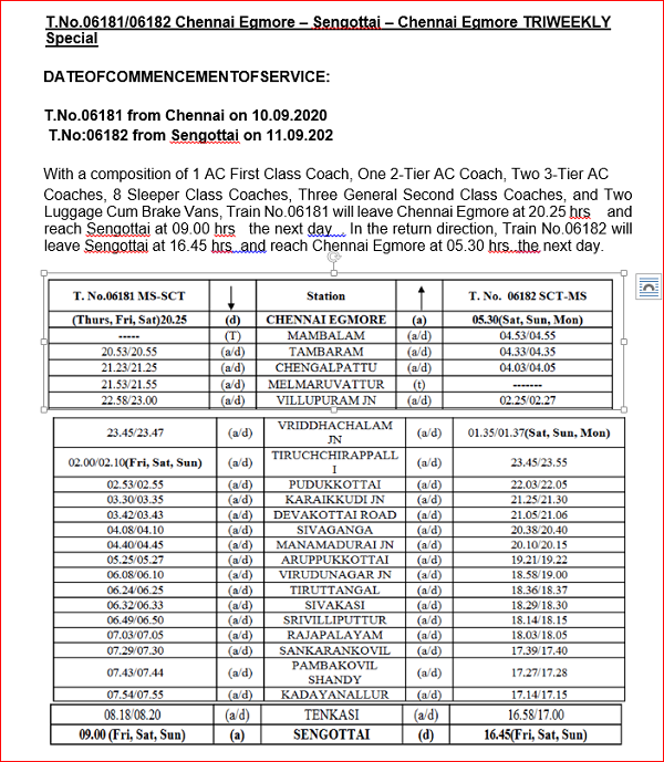 Train No.06181/06182 Chennai Egmore – Sengottai – Chennai Egmore TRI-WEEKLY Special