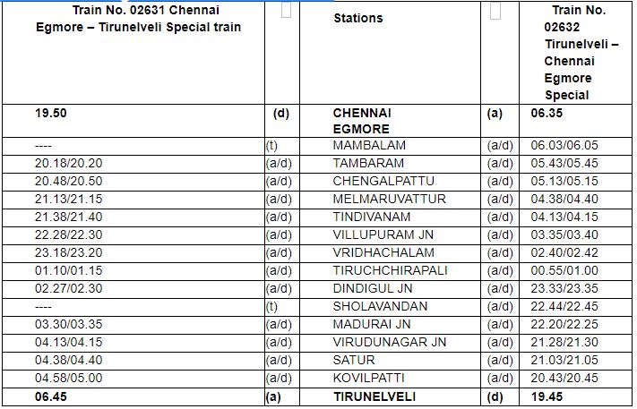 - Special train between Nellai Express Chennai Egmore-Tirunelveli (Train No 02631/ 02632)