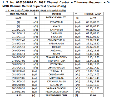 Special train between MGR Chennai Central-Thiruvananthapuram (Train No 02623/ 02624) time table, route, frequency and fare