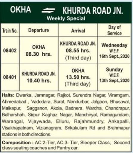 Train No 08402 Okha – Khurda Road Jn Special train will leave from Okha on every Wednesday at 08.30 hrs w.e.f 16th Sept, 2020 & will reach Khurda Road Jn. on every Friday at 08.55 hrs.