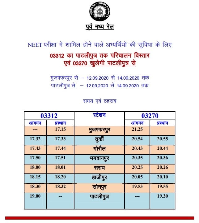 NEET For the convenience of candidates from 12.09.2020 to 14.09.2020 03312 Raxaul-Muzaffarpur special route expansion will be open till Pataliputra and in return 03270 from Pataliputra station to Muzaffarpur