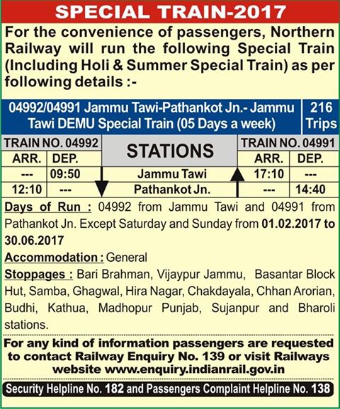 Special Trains 2017 : Jammu Tawi – Pathankot Jn. – Jammu Tawi