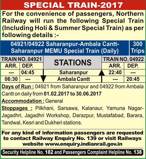Special Trains 2017 :   Saharanpur – Ambala Cantt – Saharanpur