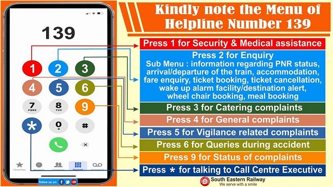 Sub Menu: information regarding PNR status, arrival / departure of the train, accommodation, fare enquiry, ticket booking, ticket cancellation, wake up alarm facility / destination alert, wheel chair booking, meal booking