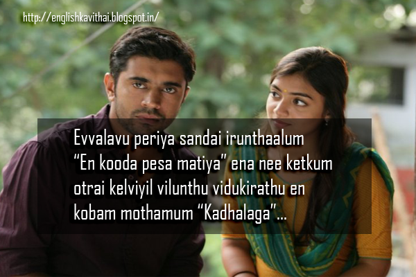 Evvalavu periya sandai irunthaalum “En kooda pesa matiya” ena nee ketkum otrai kelviyil vilunthu vidukirathu en kobam mothamum “Kadhalaga”… love kavithai in english – tamil kavithai By telugulyricsPosted on August 24, 2016Posted in love kavithaiTagged Love Kavithaigal Post navigation Tamil Kavithai | Love Kavithailove kavithai in english | tamil kavithai Leave a Reply Cancel replyYou must be logged in to post a comment.