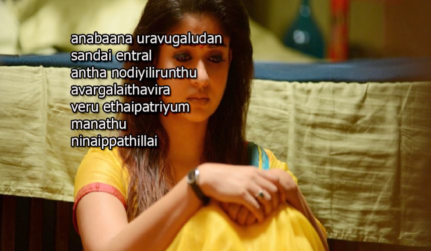 anabaana uravugaludan sandai entral antha nodiyillirunthu avargalaithavira veru ethalpatriyum manathu ninaippathillai Love Kavithai | Sad Love Kavithai In Tamil By telugulyricsPosted on October 26, 2017Posted in Sad Love Kavithai Post navigation Kavithai In English | Thanglish Love Kavithaigal ImagesLove Kavithai | Cute Love Poems Leave a Reply Cancel replyYou must be logged in to post a comment.