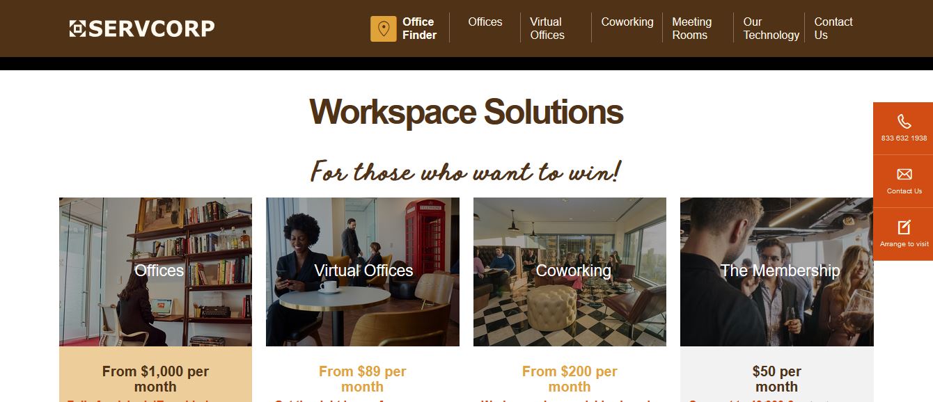 1. Servcorp : Servcorp gives a extensive variety of office area options for businesses. Learn about our digital office, workplace space, assembly room and more!