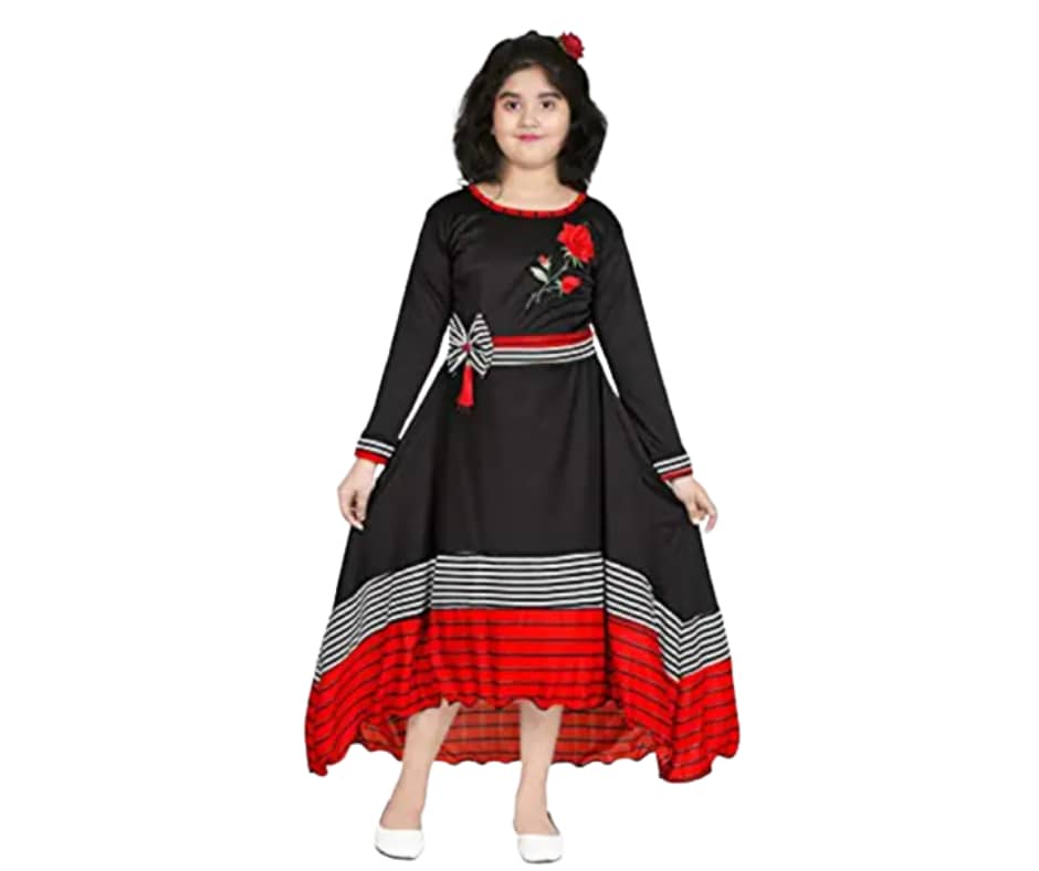छोटे बच्चों के फैंसी कपड़े के लिस्ट का यह लास्ट ड्रेस है यह ड्रेस उन लड़कियों के लिए है जिनकी उम्र 8 से 10 साल तक है इस ड्रेस पर ब्लैक एंड रेड का कलेक्शन काफी दमदार नजर आ रहा है ड्रेस के सबसे ऊपर फूल का डिजाइन प्रिंट हुआ है एंड गले पर रेड कलर का बॉर्डर लगा हुआ है|