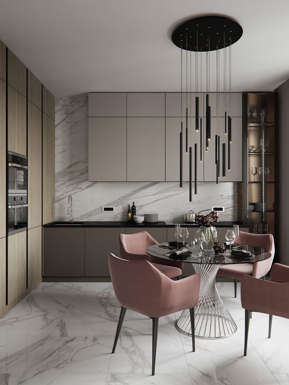 In dining rooms or bar areas, the lighting needs to be soft to create a relaxing atmosphere. Therefore, hanging spotlights are the best choice for these areas as they create a spotlight effect on the surface and keep the rest of the area in shadow. They can also be used over kitchen counters, especially those that are used for dining.