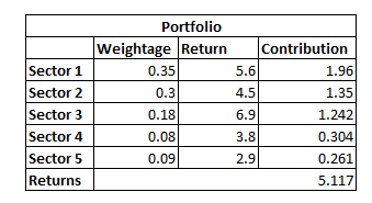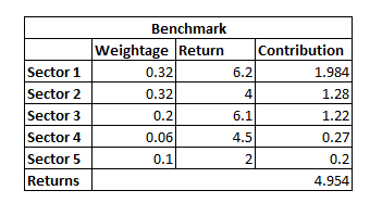 Contribution is calculated by multiplying weightage and returns achieved from that particular sector. The Sum of contribution will be the Return on investment earned on the benchmark portfolio. Which is equal to 4.954%. In the image below Weightage shows the fund manager’s weightage in that particular sector and returns achieved from that particular sector.