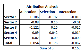 Asset Allocation effect= (Benchmark return for each sector * Overweight value by the fund for that sector)
