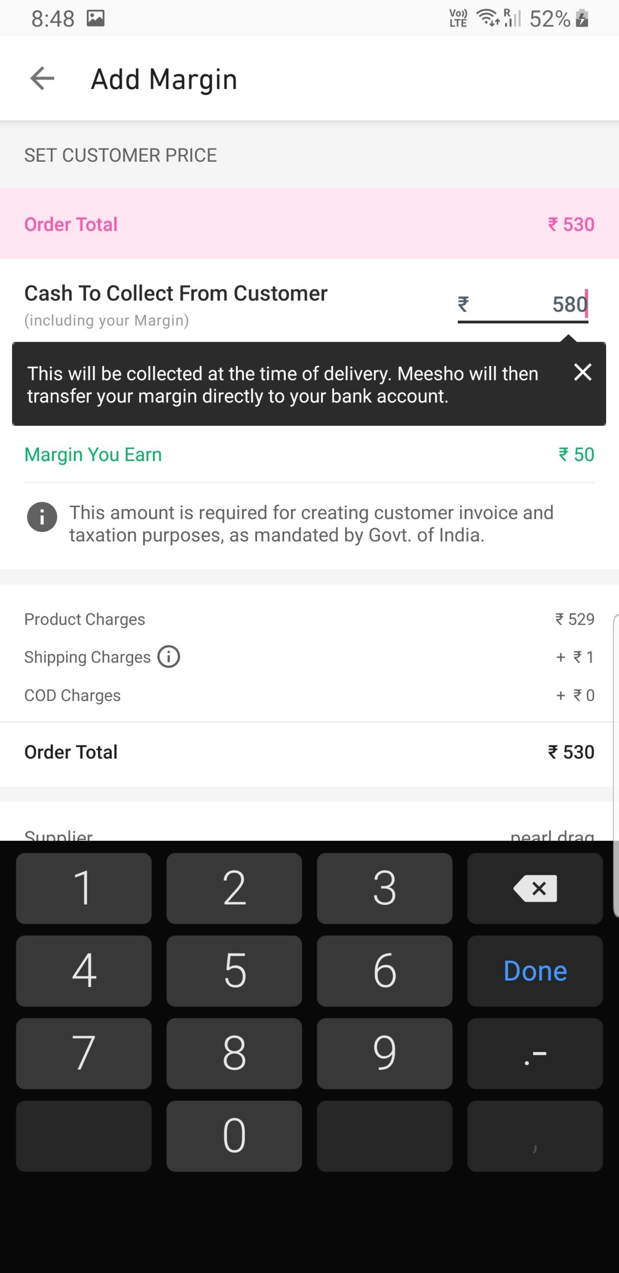 You can select the option and click on proceed. There you need to mention the cash to collect from the customer including your margin. So that amount will be printed on Delivery Package to customers and they will pay that amount to the delivery guys of Meesho.