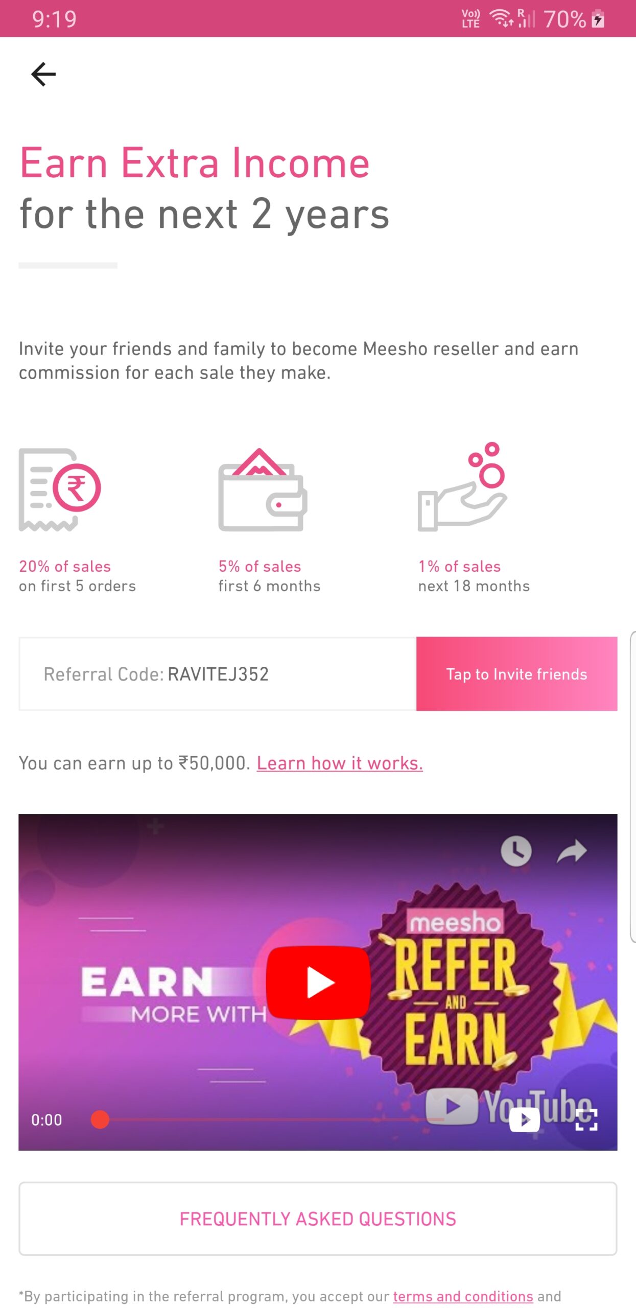 On the Meesho Credits option, you can get bonuses which will be added to your wallet every Tuesday if you have reached the goal. And also there is a referral program to this app, where you can refer and earn 20% of sales on the first 5 Orders, 5% of sales in the first 6 months &  1% of sales for the next 18 months.