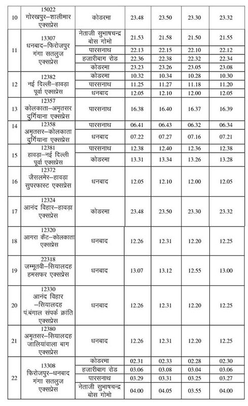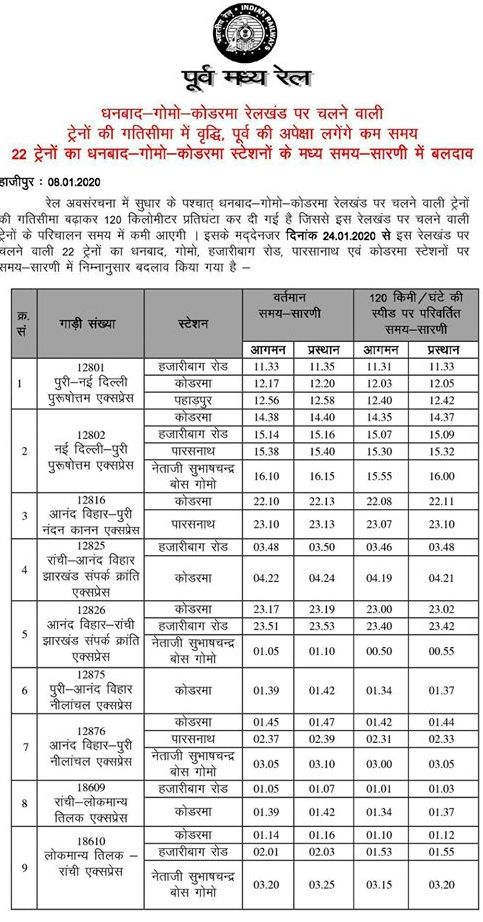 Changes in the timetable of these trains at various stations in this rail section due to the increase in the operational speed limit of 22 trains in the Dhanbad – Gomoh – Koderma rail section to 120 km per hour.