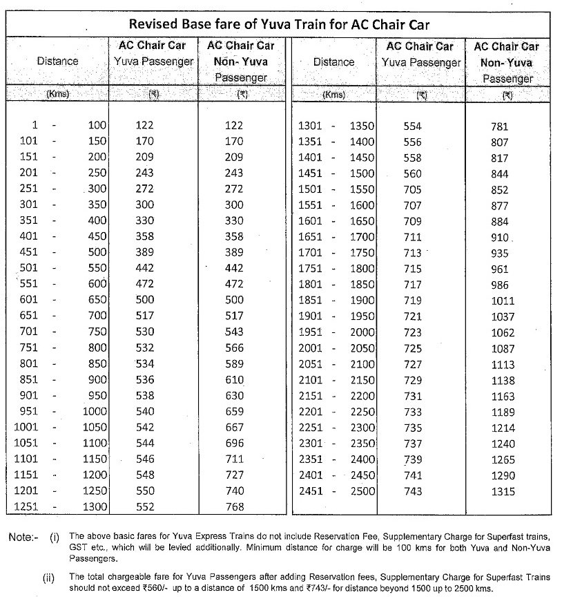 AC Chair Car Yuva Passenger and AC Chair Car Non Yuva Express Fare Table 2025-2025