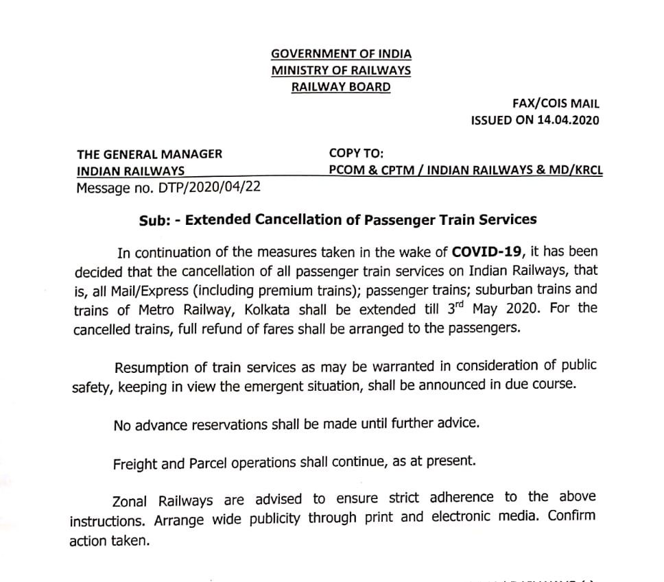 In continuation of the measures taken in the wake of COVID-19, it has been decided that the cancellation of all passenger train services on Indian Railways, that is, all Mail/Express (including premium trains); passenger trains; suburban trains and trains of Metro Railway, Kolkata shall be extended till 3rd May 2025. For the cancelled trains, full refund of fares shall be arranged to the passengers.