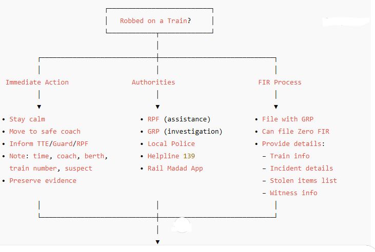 If you get robbed on a train, immediately inform railway staff like the TTE, Guard, or RPF and note key details such as train number, coach, berth, time, and suspect description. The RPF provides assistance, but the GRP (Government Railway Police) is responsible for registering the FIR and investigating the case. You can also file a Zero FIR at any police station if you have left the station. Complaints can be made through 139 Railway Helpline or Rail Madad App/Website. Provide full details of the incident and stolen items in the FIR. Legally, theft falls under IPC 379 and robbery under IPC 392. To prevent such incidents, keep luggage locked, stay alert, and avoid exposing valuables.