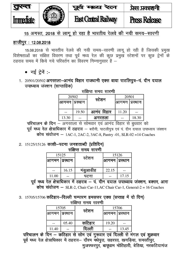 Download in pdf file : East-Central-Railway-New-Time-Table